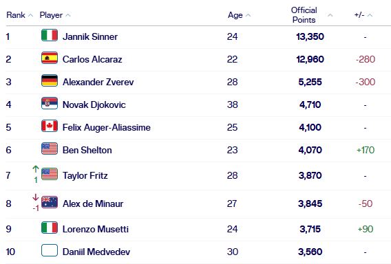 Hazırda reytinqin birinci pilləsində italiyalı tennisçi Yannick Sinner qərarlaşıb. O, 13 350 xal toplayaraq ən yaxın rəqiblərini geridə qoyur və liderliyini qorumaqda davam edir. İkinci yerdə isə ispaniyalı Karlos Alkaras yer alıb. Onun hesabında 12 960 xal var və o, zirvə uğrunda mübarizəni davam etdirir.