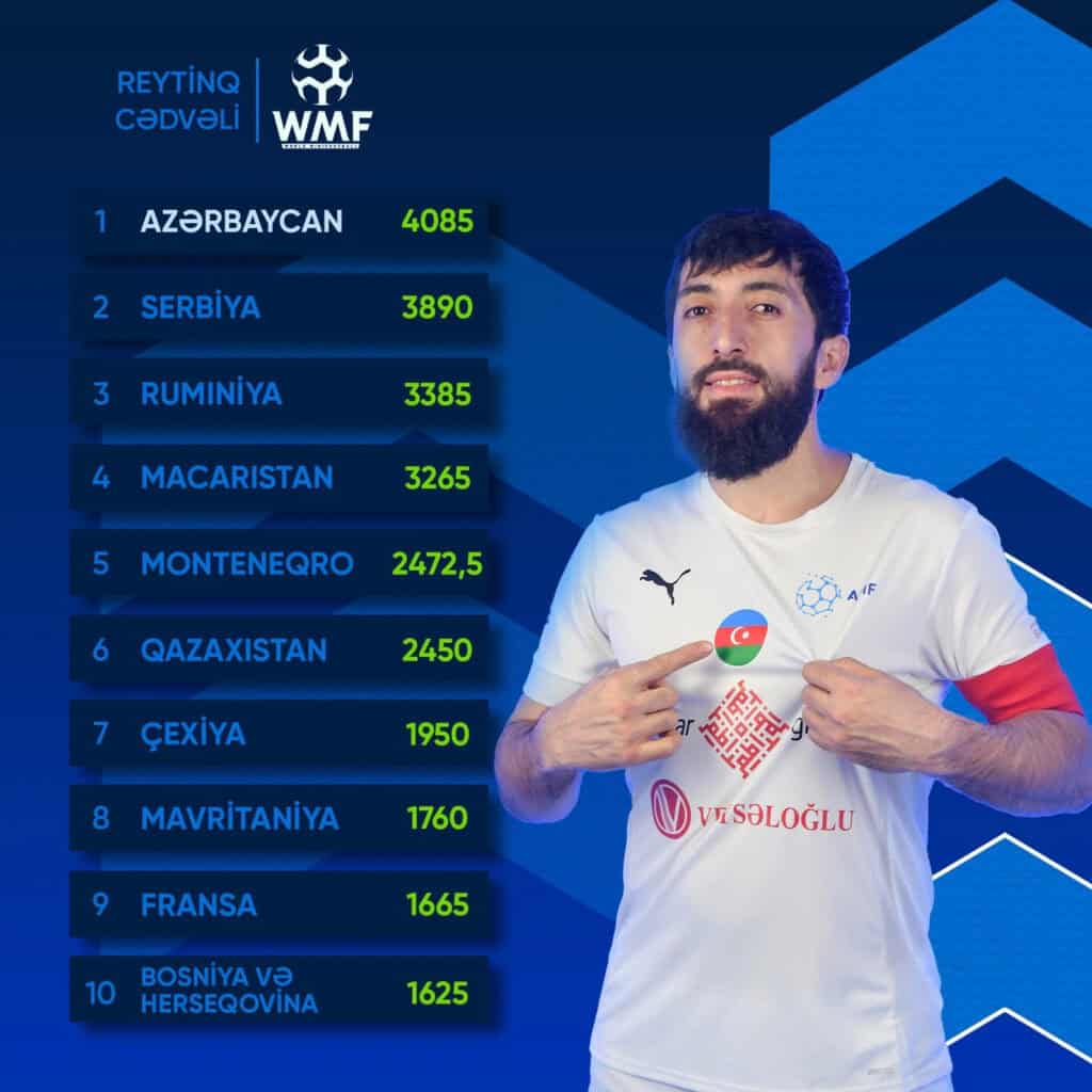 Dünya Minifutbol Federasiyasının (WMF) açıqladığı son reytinq siyahısına əsasən, Azərbaycan millisi 4085 xalla bütün rəqiblərini geridə qoyaraq birinci pillədə qərarlaşıb. Xüsusilə son dünya çempionatında qazanılan çempionluq bu yüksəlişdə həlledici rol oynayıb.